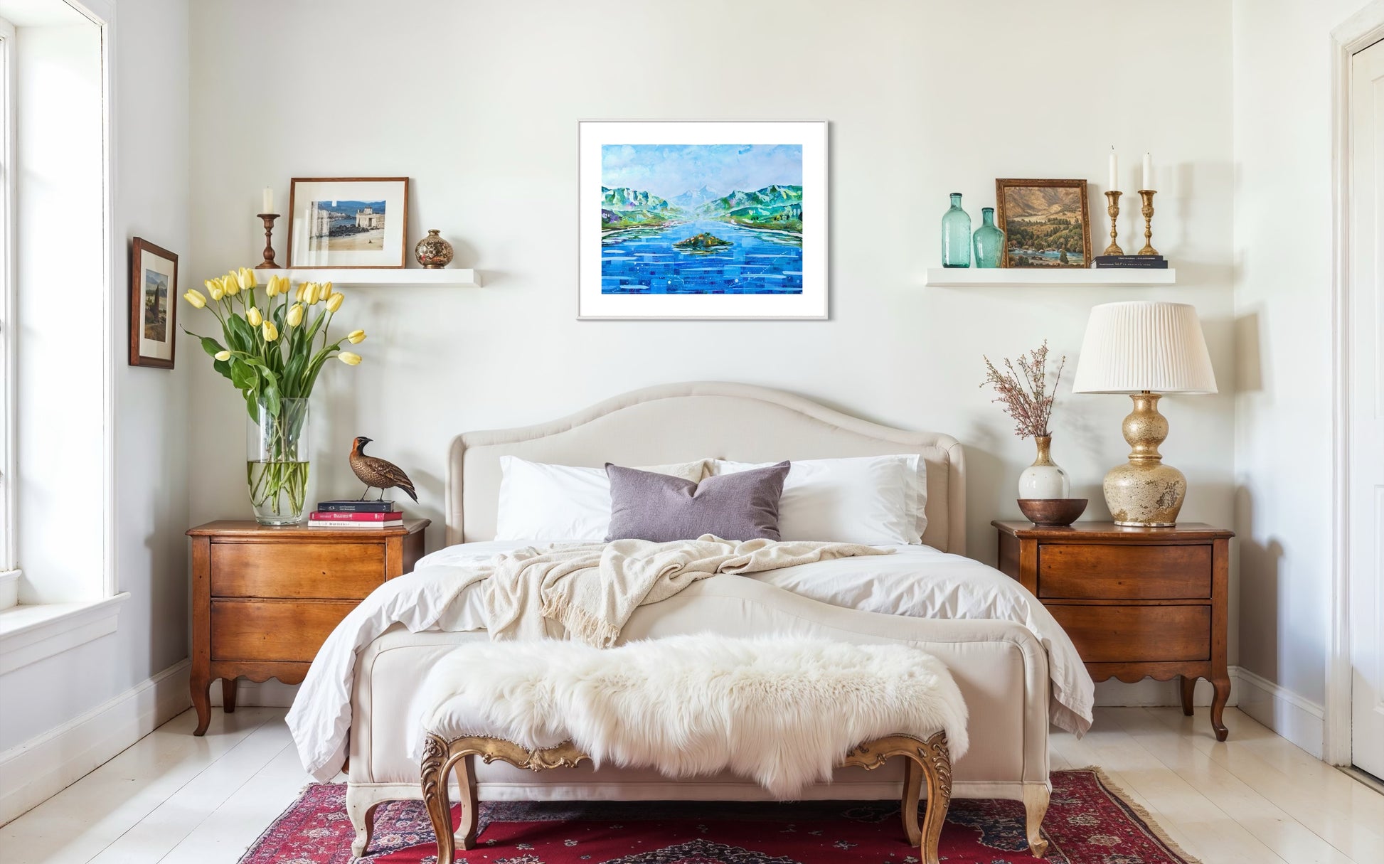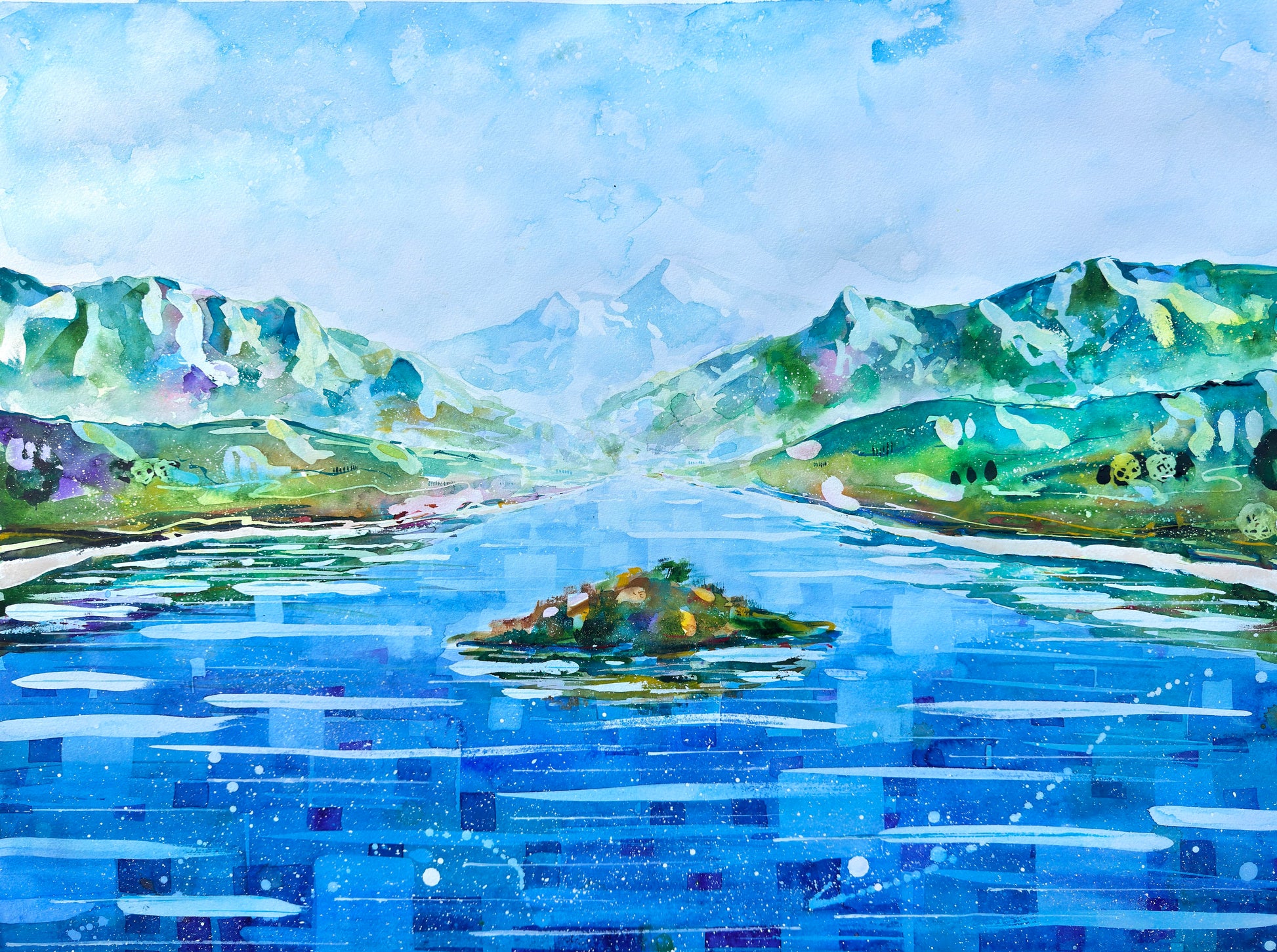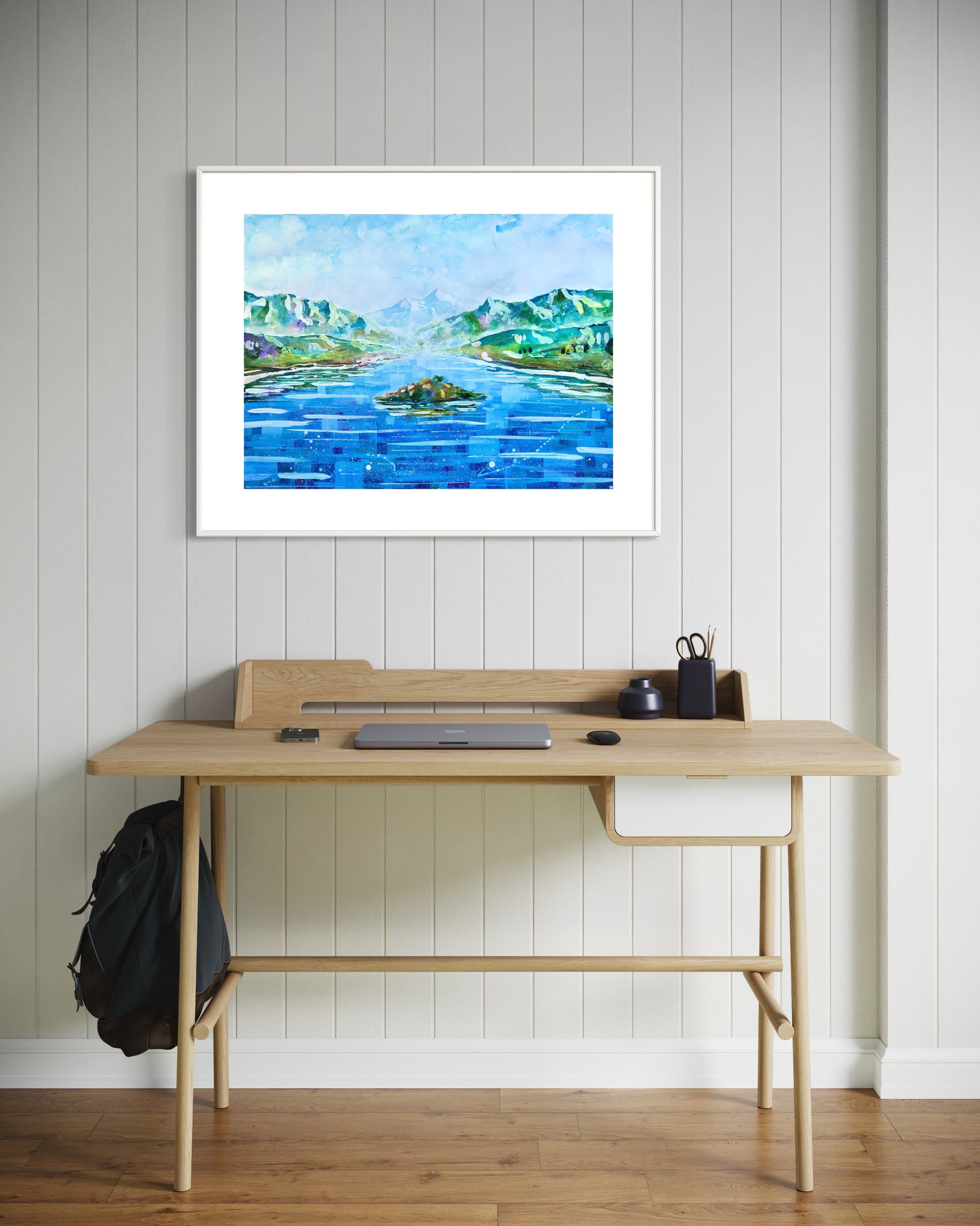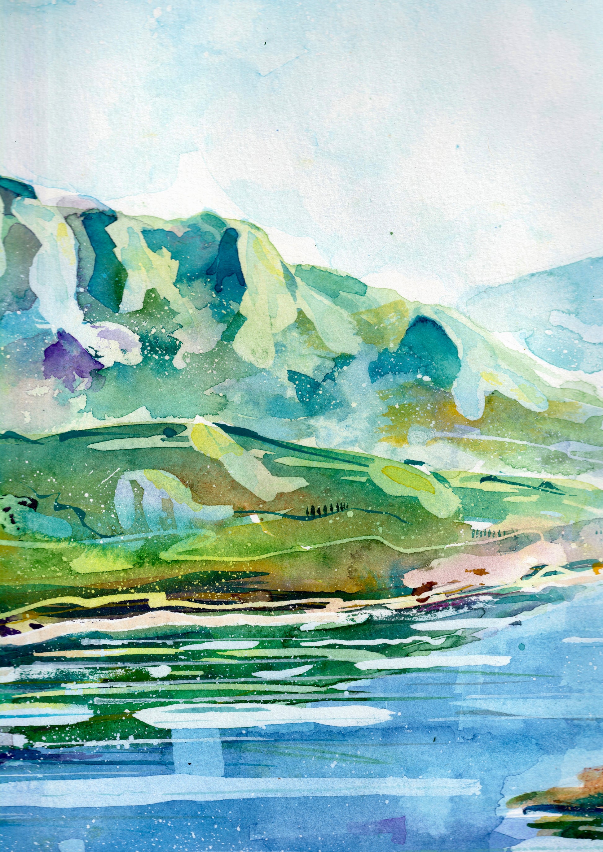 This is actually the second painting of this view, which is an interpretation of the landscape just in front on the holiday home in which I was staying. I found it therapeutic to revisit this scene with an emotion of hopefulness for whats ahead. The colours are punchy and deep, I hope I've captured the sense of space and water.