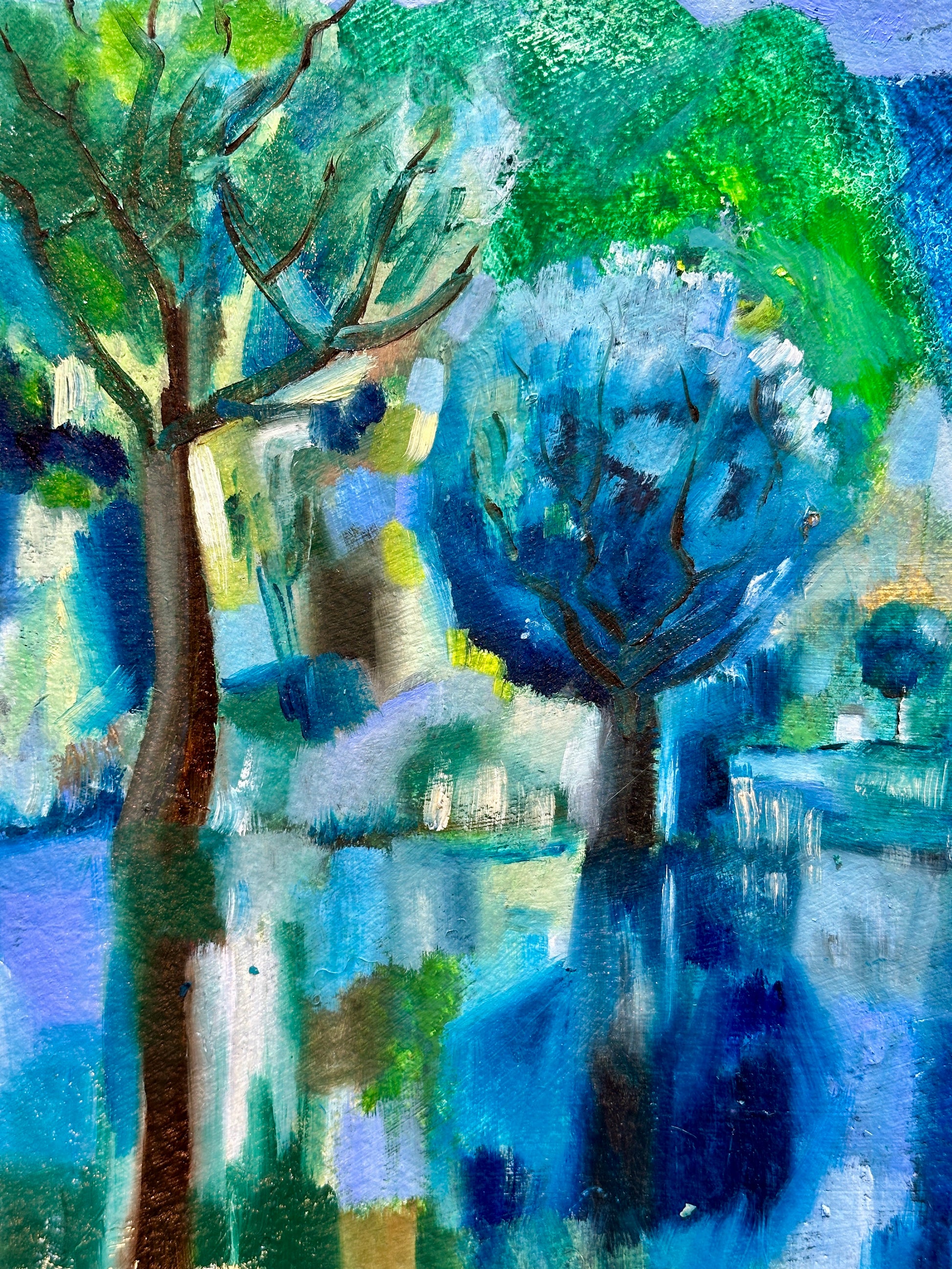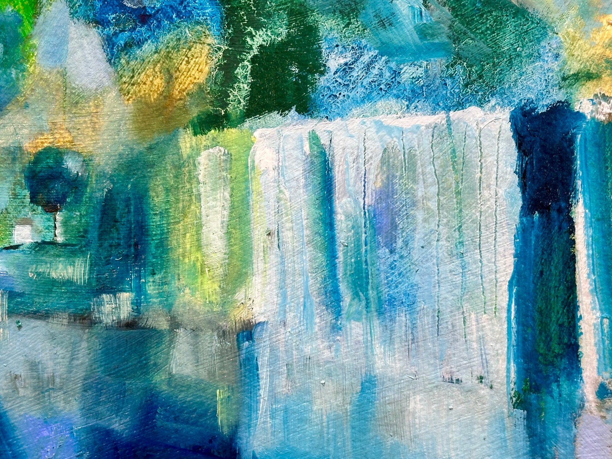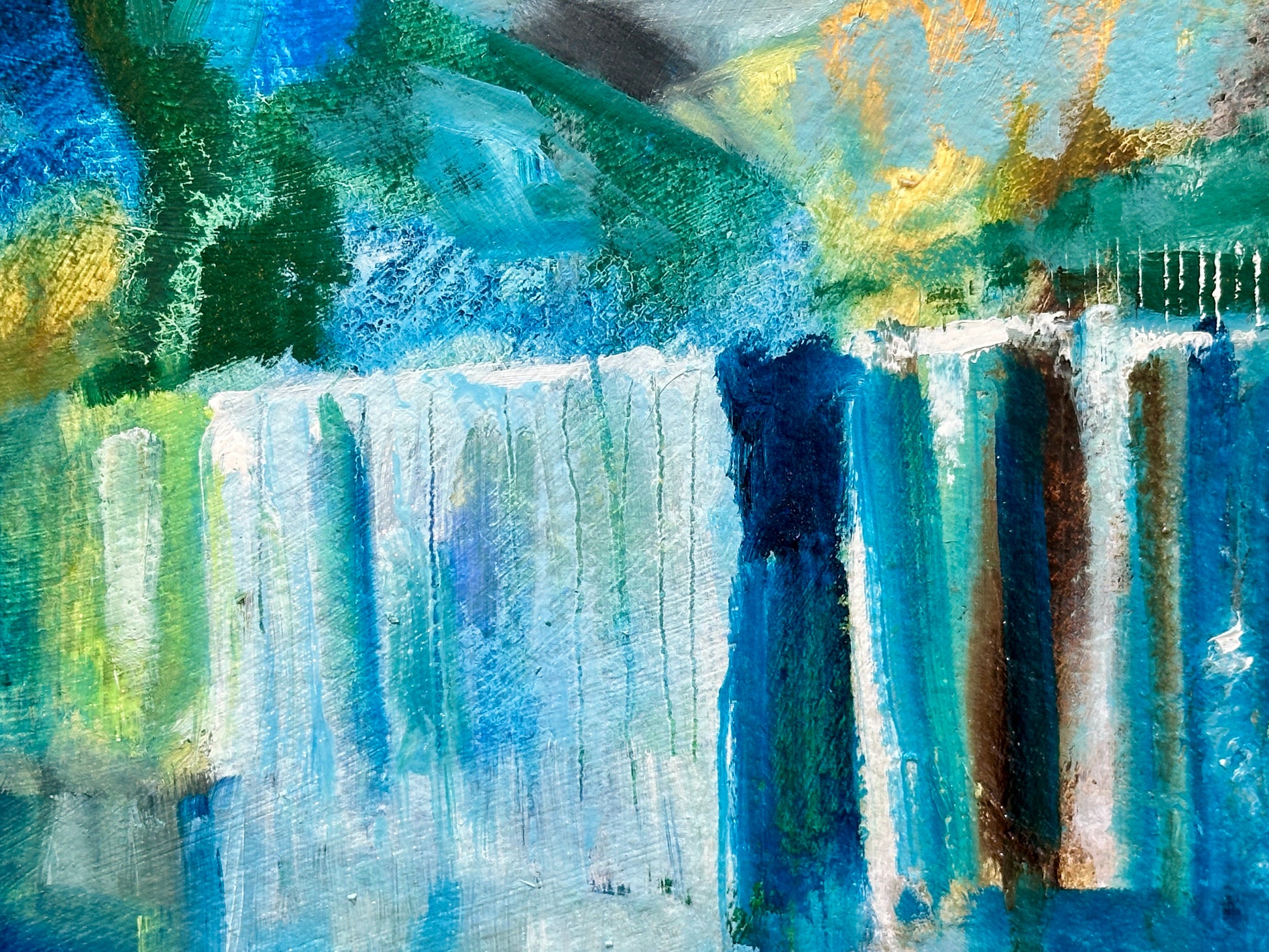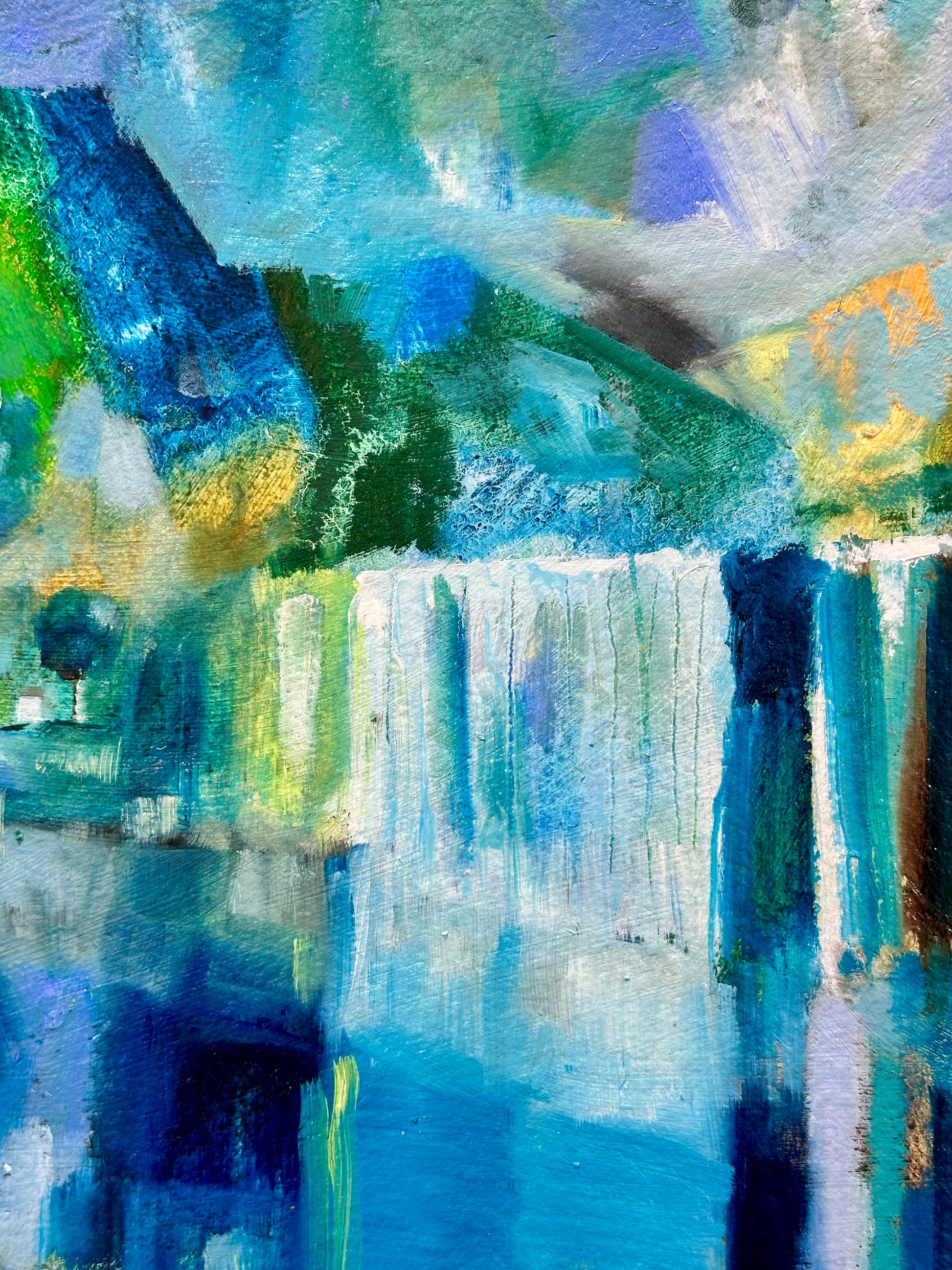 Then when I looked at it finished, I thought - well, that's nice and peaceful. I love, I mean really love trees, water and mountains, preferably all together and throw in a waterfall and I'm pretty mesmerised. I'd hope a bit of love made its way into this and perhaps you might get a glimpse of that. I imagine myself in the world of this painting and I hope you might too.