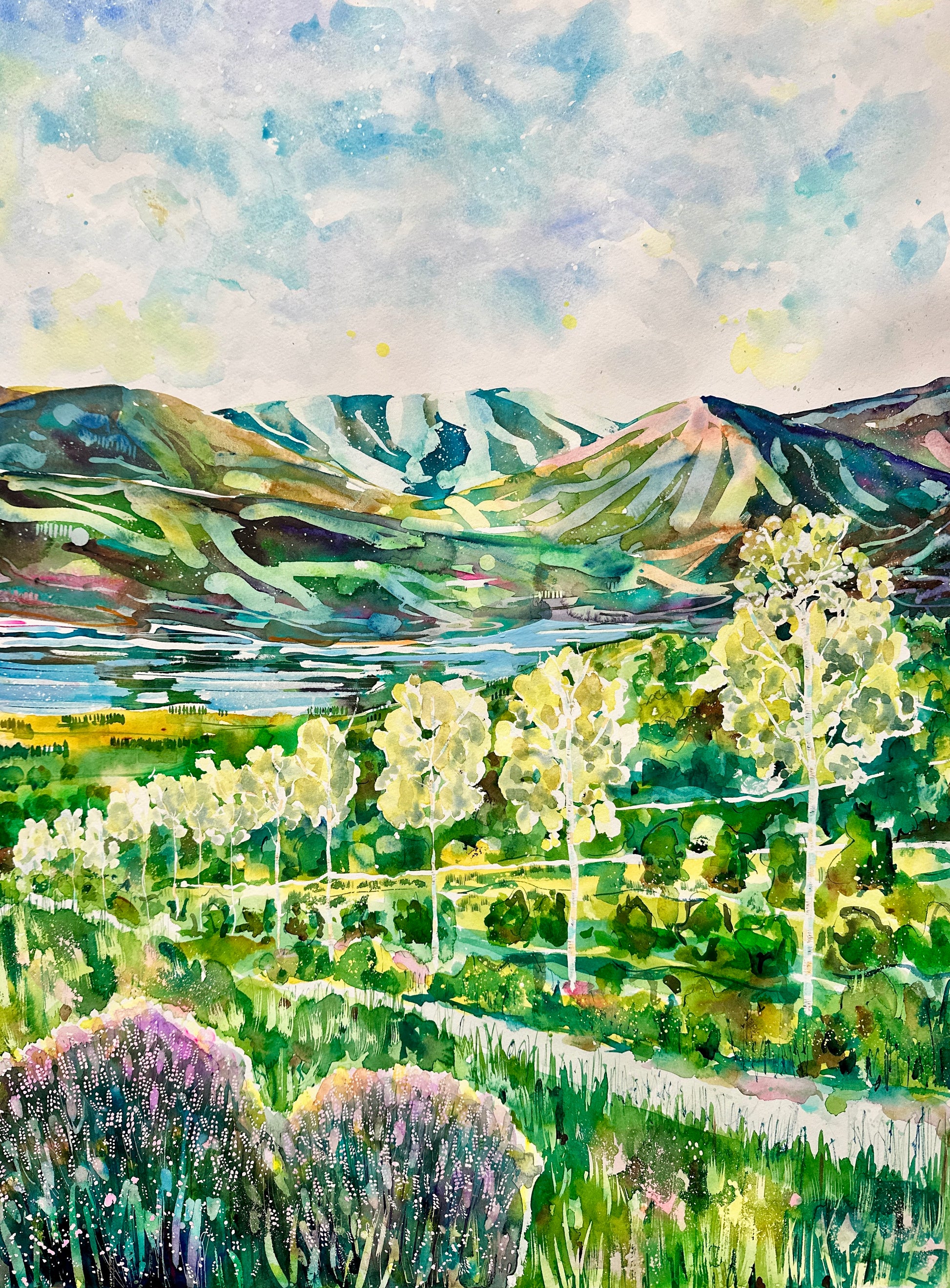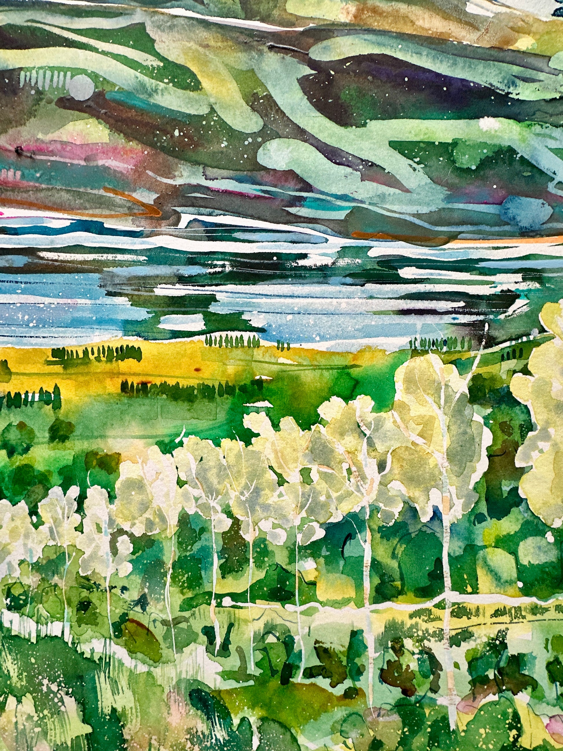 In this painting I wanted to convey a sense of climbing high to a vantage point, a pathway traversing from a distance to the point we look back and admire what we can see.