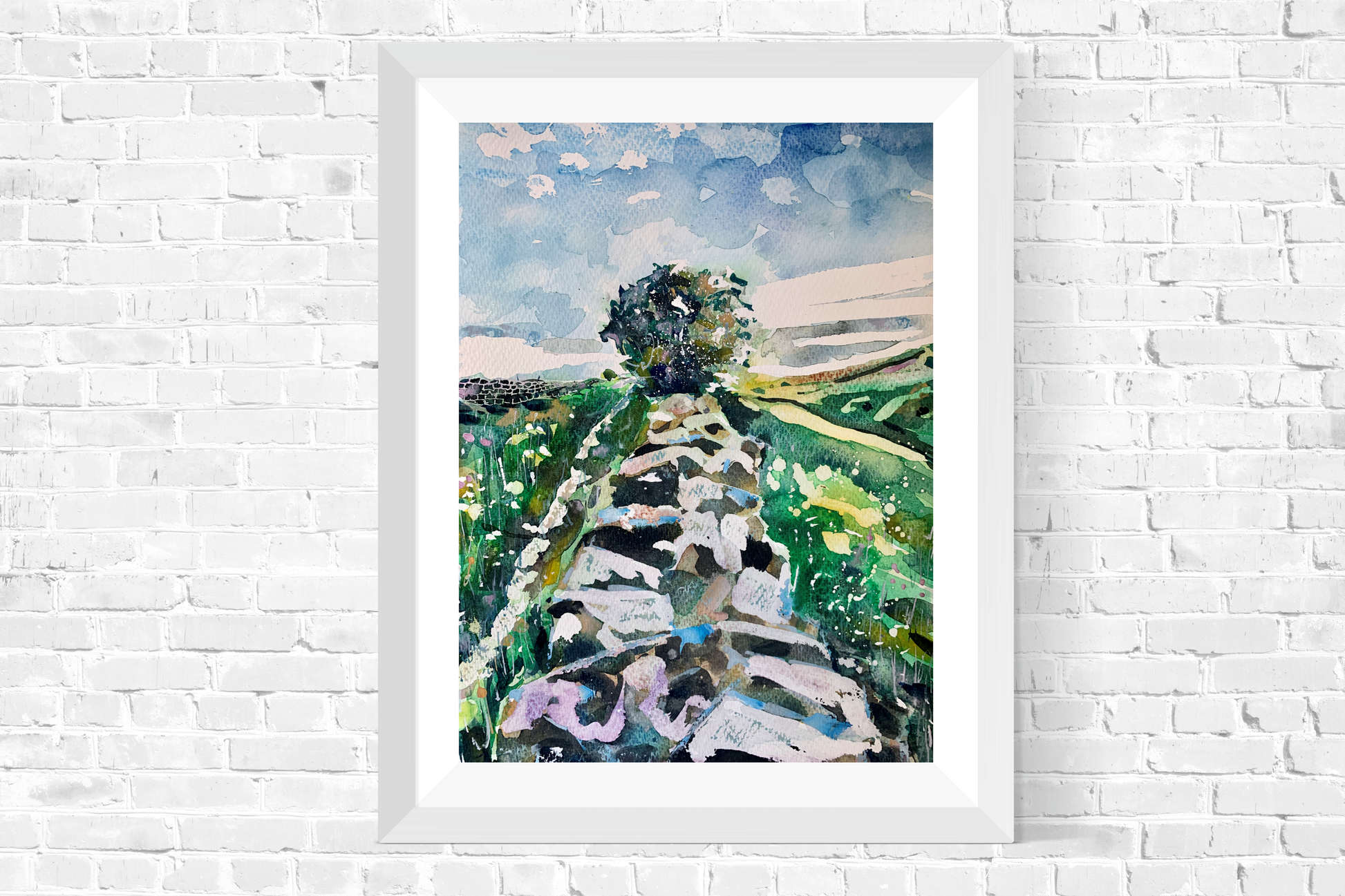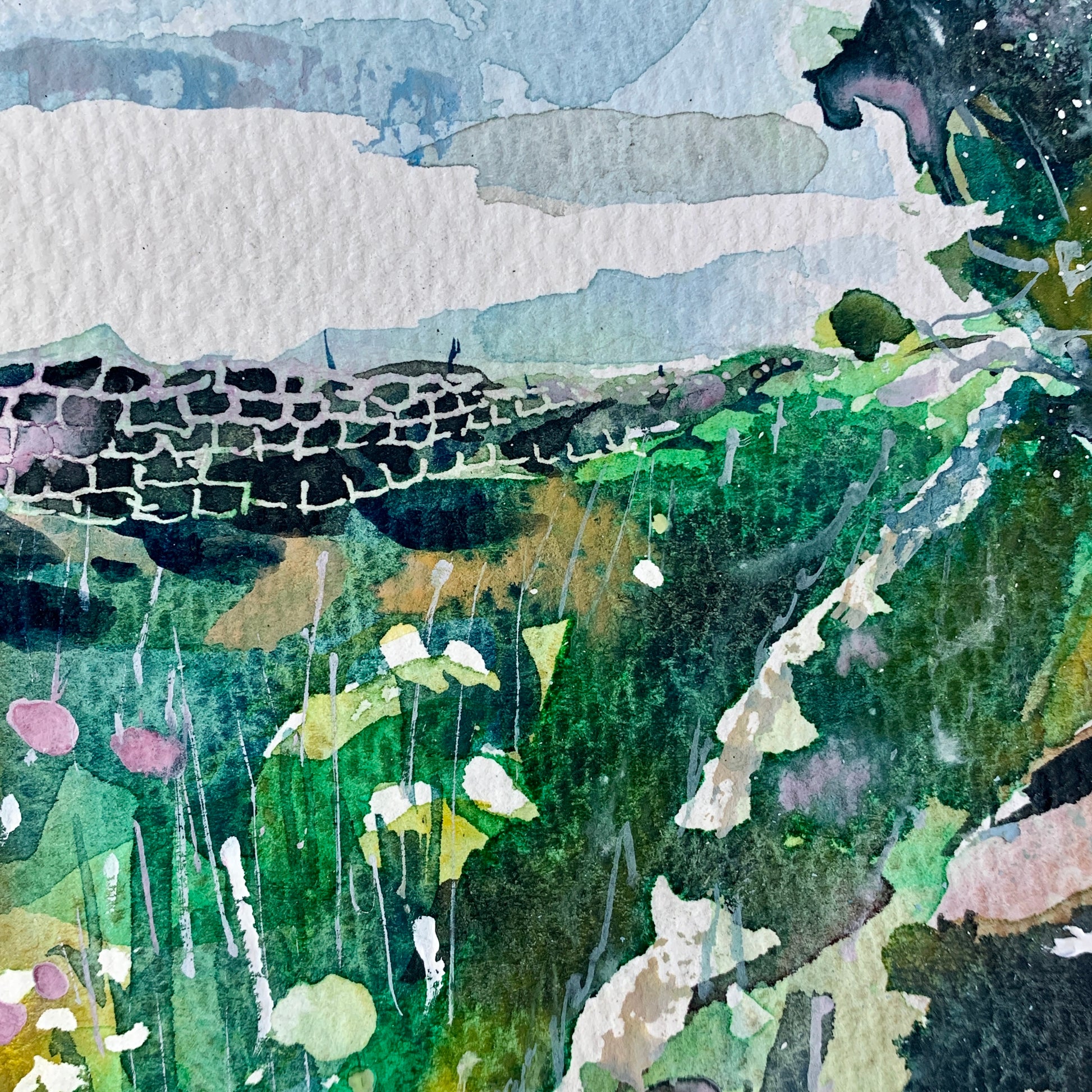 On one day during my visit we went for a long walk and as we ascended up toward Framington Edge we passed up a gorgeous pathway edged by two dry stone walls. The fields and copses here are surrounded by these walls, like veins across the landscape. Half way up there was a hawthorn tree, jagged and full of white flowers. I stood on top of the wall and took a quick sketch and a photo, the light was perfect, across the landscape and meadows strewn with buttercups.