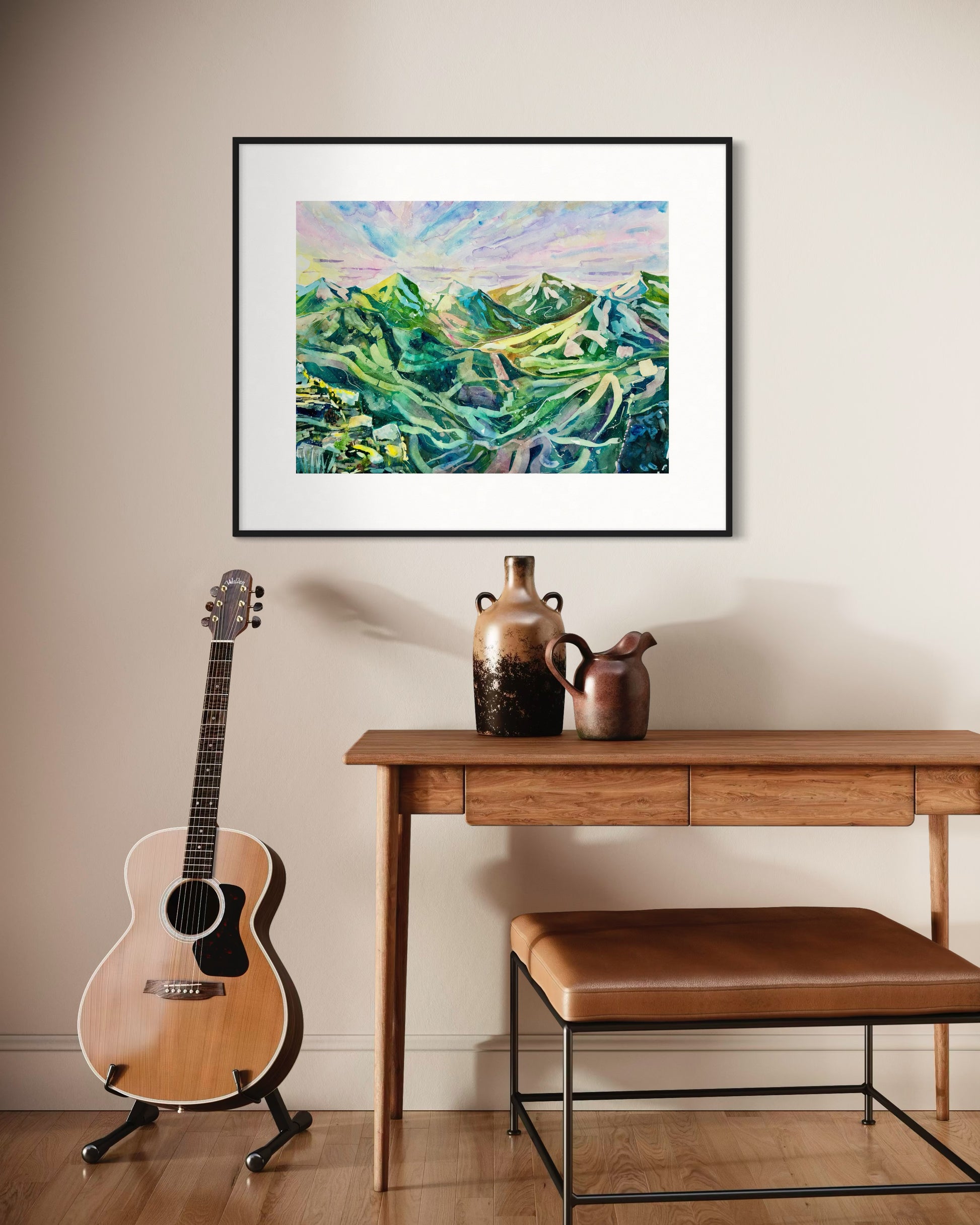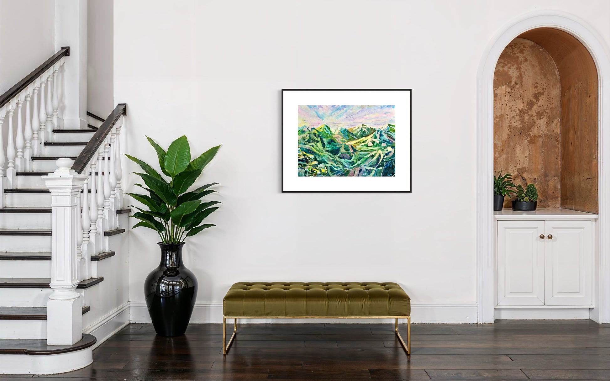 I've tried to capture all of this emotion in this painting. To imagine standing on a ledge looking over such vastness all in view as if you are flying, looking down. I wanted to create the pull from the brush marks, the sky straining into a dramatic sunset.