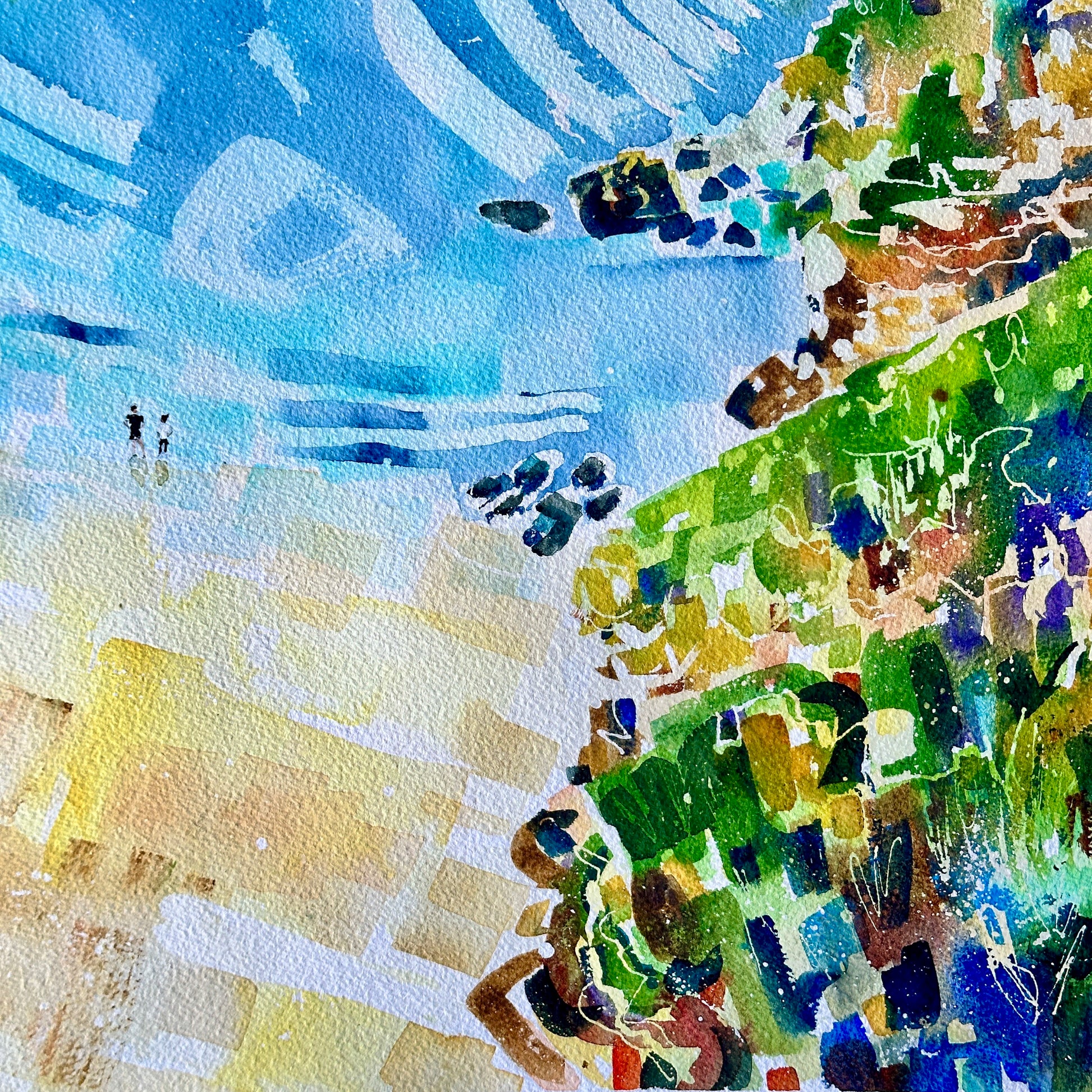 We are not defined by times in which we struggle, I tell myself this because it takes strength to reawaken to the light that exists all around us. As I clambered over the safety structure of the cliff walkways of the peninsula here, I got to the edge and looked down upon the view that's in this painting. The colours were ablaze in the afternoon sun and two people stood looking out, the moment caught me. I was reminded of how important companionship is, of my friends and family. I thought about who I might like to have standing next to me, looking out at the horizon.